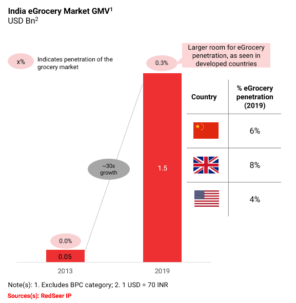 The eGrocery market GMV was mere $0.05 Bn in 2013, but has grown 30x in the last 6 years to reach $1.5 Bn GMV in 2019. Despite the humongous growth, eGrocery only accounts of 0.3% of the overall grocery spend in India i.e. significantly less compared to developed countries like China, UK and US.