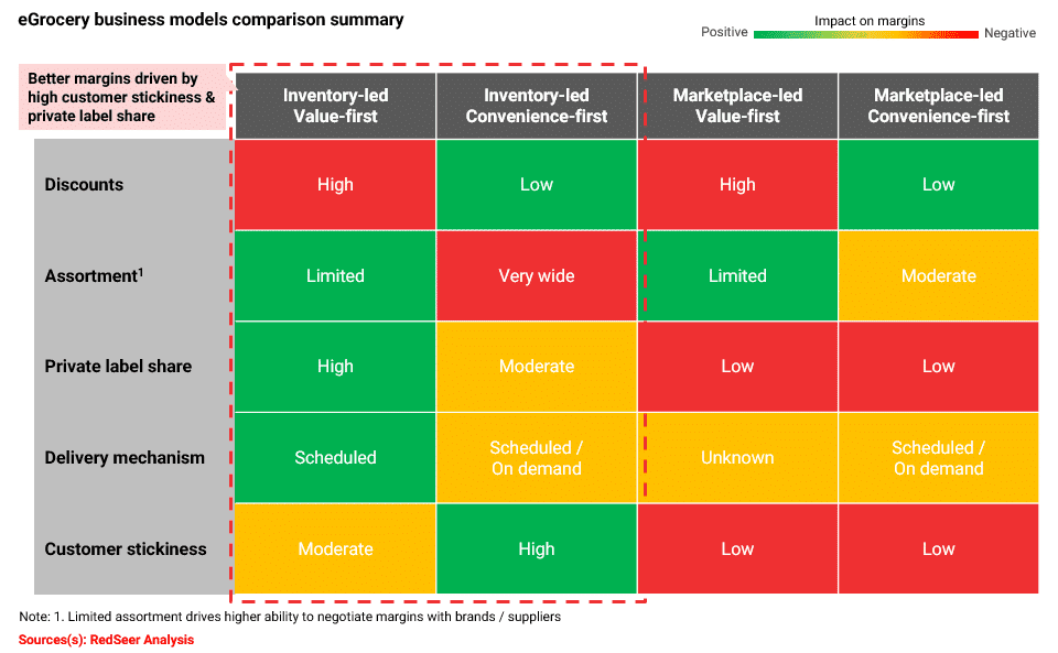 Among the different eGrocery models, inventory-led models are better placed on margins and hence are likely to be more sustainable. This is because they’re likely to perform better on private labels and consumer stickiness.