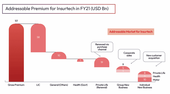 By FY27, we expect the overall insurance market to reach $250 Bn. Of the $117 billion of premium underwritten in FY21, ~$50 billion is addressable for insurtech. Technology has already transformed the way insurance is bought and sold in India.