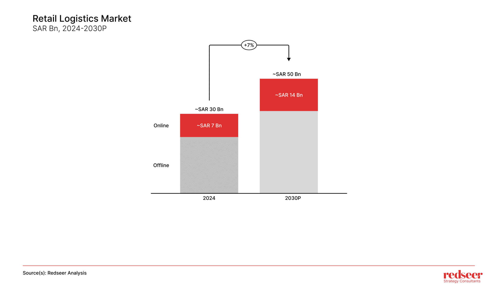 At present, the online retail logistics market is valued at SAR ~7 Bn expected to grow to SAR ~50 Bn by 2030