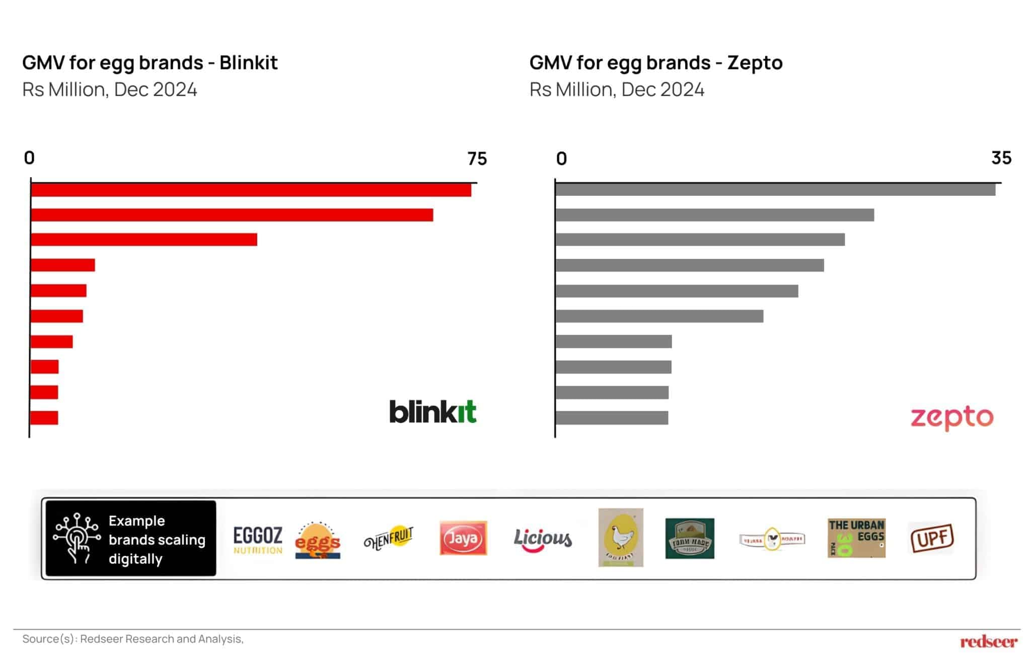 The turning point arrived in the last five years with new-age brands achieving over 50% of sales through quick commerce, offering 10-minute delivery of premium options. Recent data from major platforms shows leading egg brands generating monthly GMV of ₹35-75 million on Blinkit, with similar performance on Zepto.