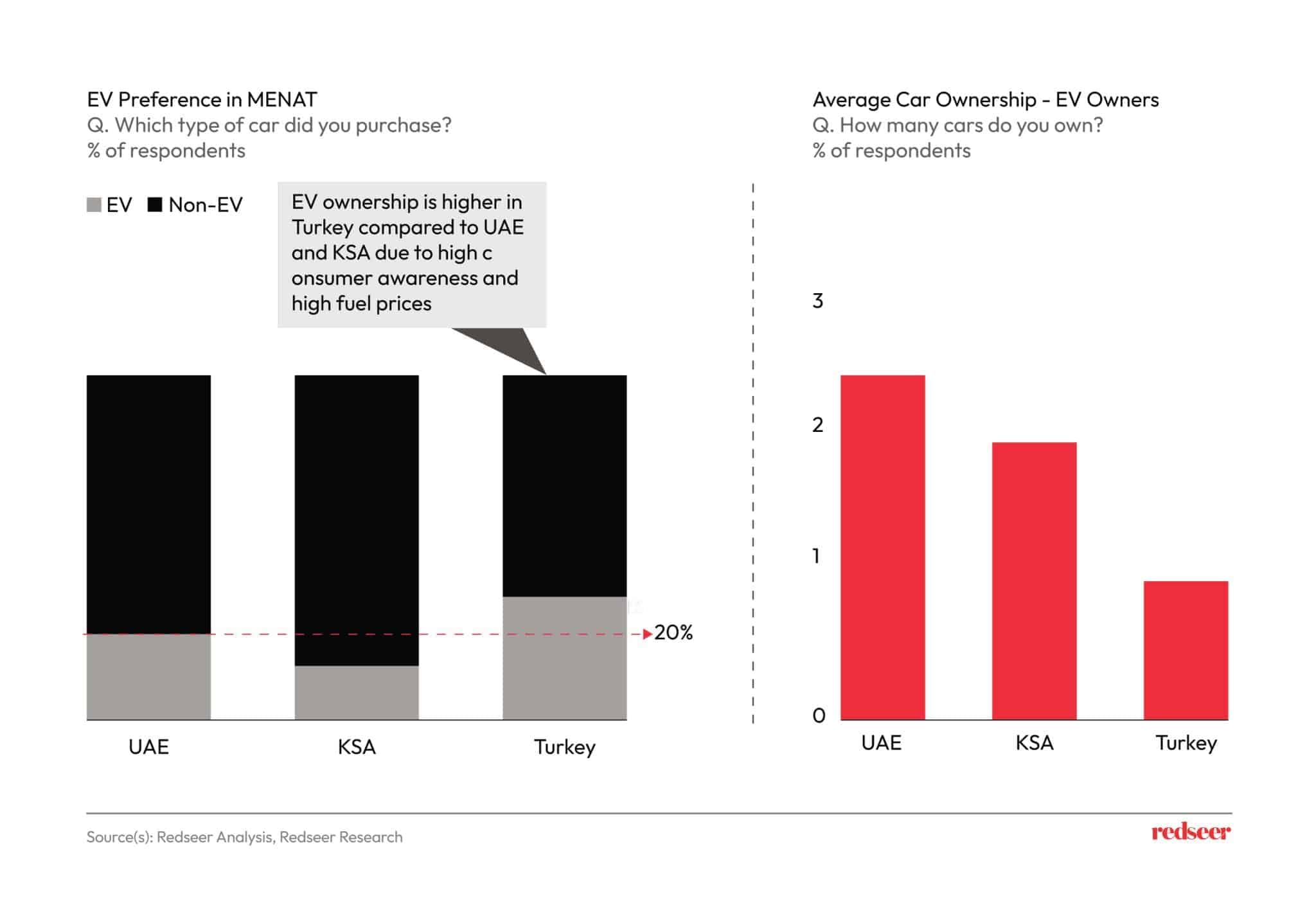In the UAE and KSA, car buyers tend to own multiple vehicles, with a rising interest in EVs as their secondary cars. However, Turkey stands out as a unique case where a substantial 40% of new car owners have embraced EVs as their primary vehicles. This contrast can be attributed to factors such as charging infrastructure limitations and range concerns in the UAE and KSA, which have led to EVs being predominantly used as secondary cars.