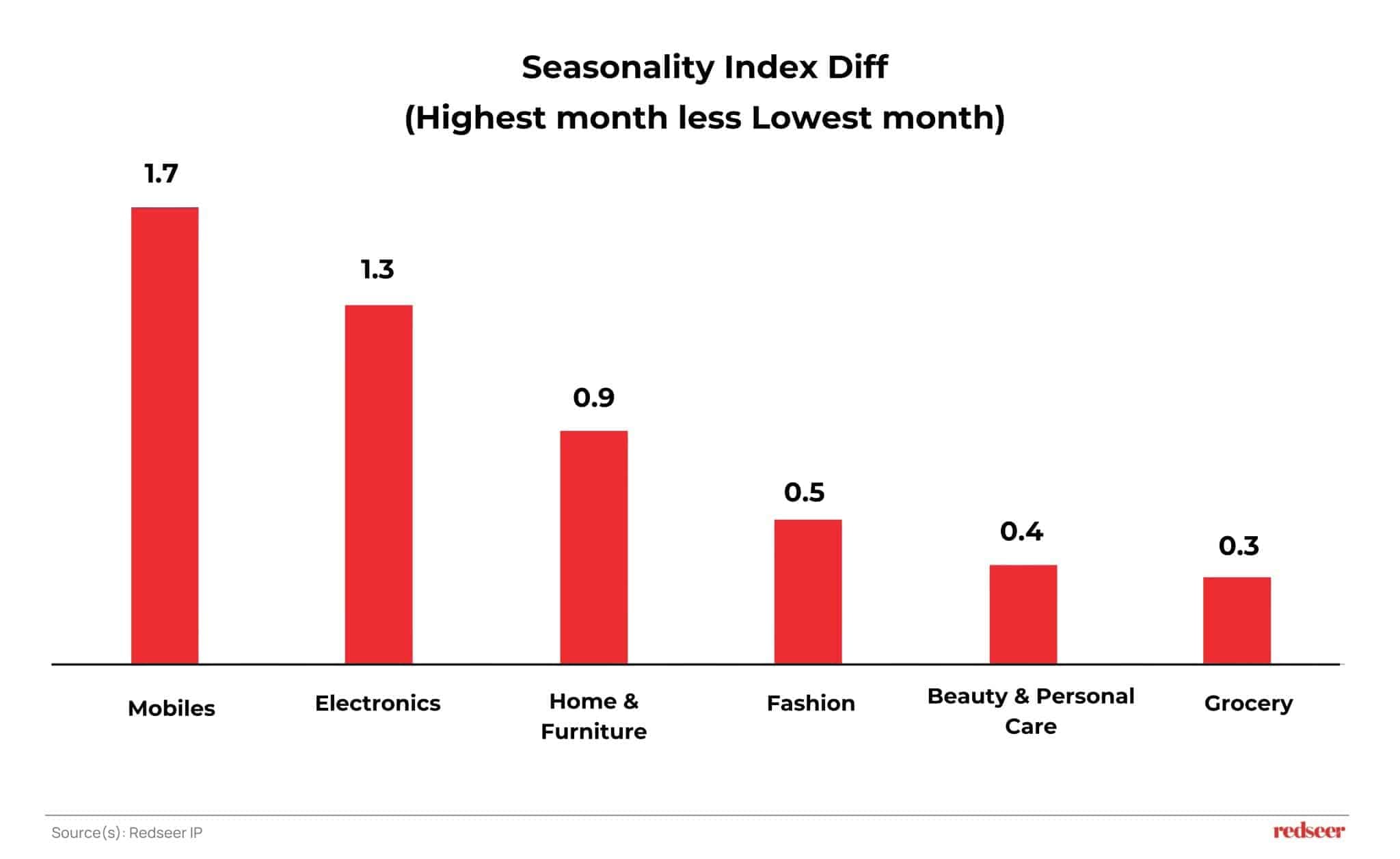 - Mobiles have the most dramatic swing, with a Seasonality Index Diff (Highest month less Lowest month) of 1.7. Electronics follows closely with a difference of 1.3.