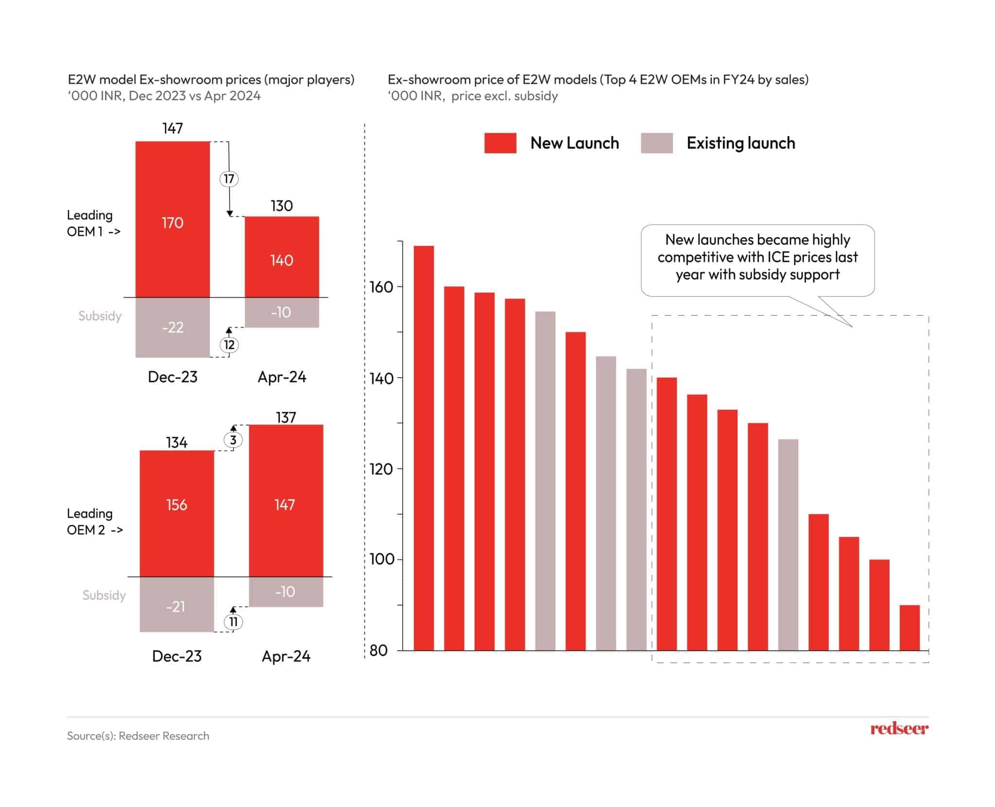 OEMs continue to support the demand for affordable E2Ws thus offsetting the FAME II discontinuation. E2W OEMs are acutely aware that while E2Ws have favourable Total Cost of Ownership (TCO) comparisons versus their ICE (Internal Combustion Engine) counterparts, the higher purchase price of E2Ws is a significant deterrent to adoption for a large section of buyers in India. E2W OEMs have stepped up their game as leading OEMs have been absorbing the impact of subsidy reductions on their existing models, either fully or in part, by reducing prices. Further, E2W OEMs also seem to be closing the gap between the ICE models with the launch of increasingly affordable models in the past few months.