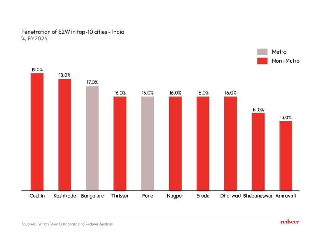As per Redseer EV Index, 8 out of the top 10 cities based on E2W penetration have been observed to be non-metros. Need of comparatively leaner charging infrastructure for E2W along with impetus from OEMs with more affordable models and ranges of E2W are few keys driving the penetration of E2W in non-metros.