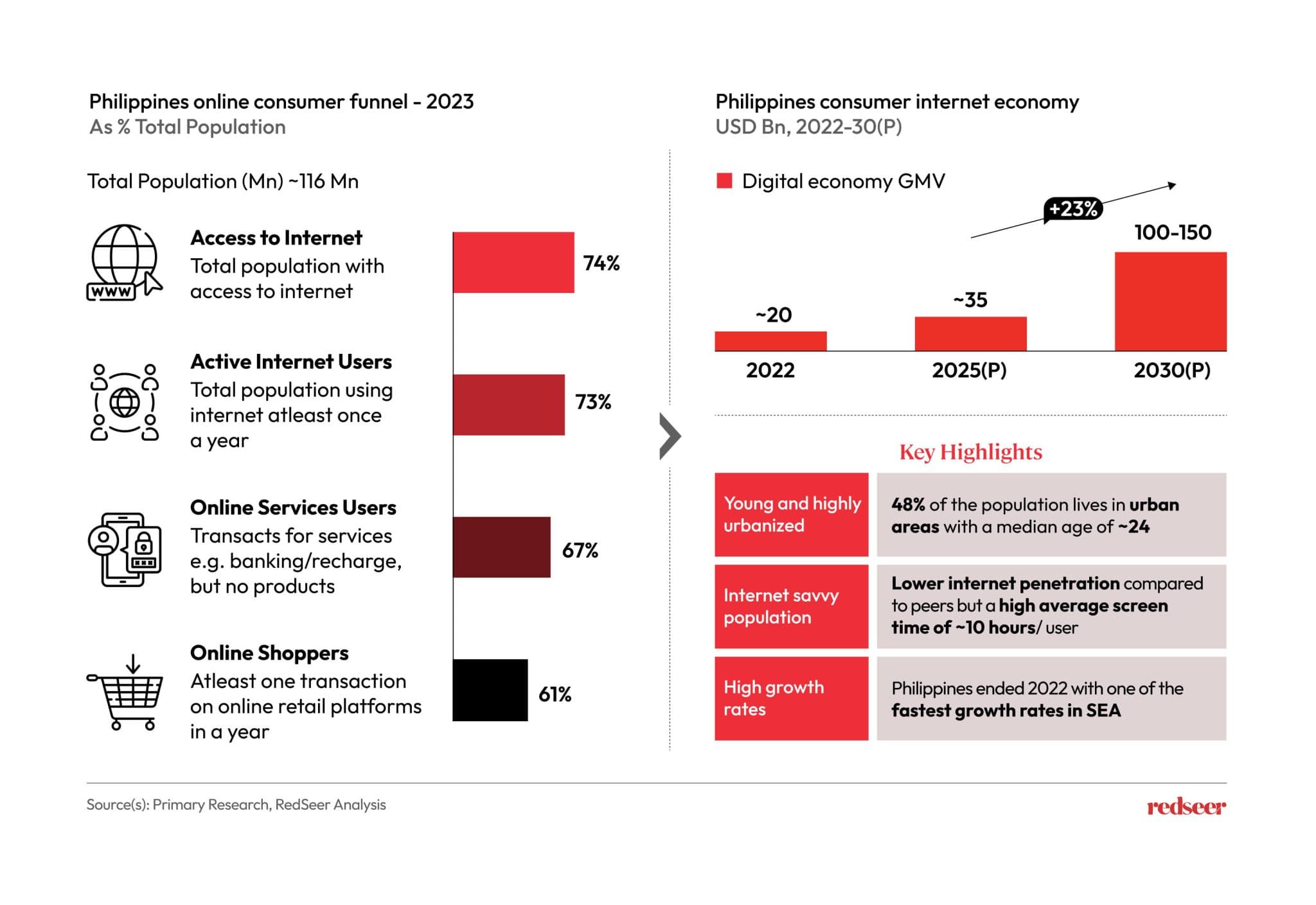 With a population of ~116 Mn, the Philippines is the second most populous country in SEA. Highly urbanized, with ~48% of the population residing in urban areas, the country has a youthful demographic, with a median age of ~26 years, which is among the lowest in Southeast Asia. Although digital penetration is lower compared to other Southeast Asian countries, the country displays a higher online shopping usage. The Philippines boasts high internet usage, with individuals who have access spending an ~10 hours per day online. This strong digital consumption, along with a young population and projected high single-digit GDP growth, provides favourable conditions for the consumer internet sector, with a CAGR of ~23% in gross GMV from 2021 to 2025.