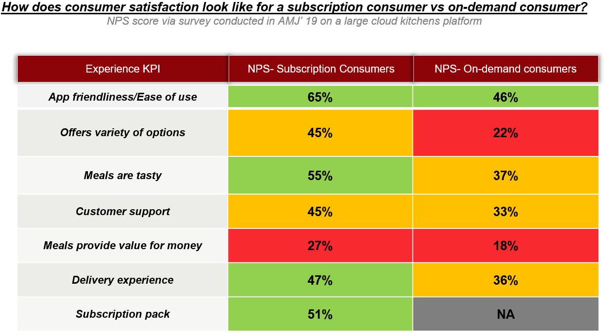 Consumers who are subscribed to cloud kitchens subscription packs are highly satisfied on most metrics (compared to non-subscribers/on-demand consumers). Indicating how platforms that increase overall user satisfaction by increasing the share of subscription buyers.