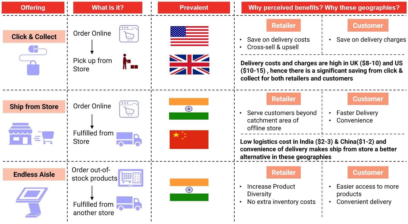 Across countries, the maturity of omni-channel elements is largely dependent on the development index, labour and logistics costs. This triggers higher adoption of click and collect in developed economies and “Ship from store” in India.