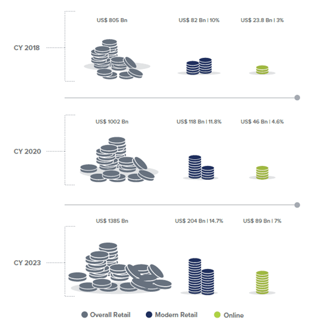 Private consumption, currently at 59% of GDP will continue to be the main driver of growth, growing at a robust CAGR of ~11% between 2018 and 2023. Merchandise retail accounts for 49% of the private consumption in 2018 and is expected to be 48% in CY 2020 driving India’s retail sector which is projected to grow from US$ 805 Bn in CY 2018 to US$ 1002 Bn by CY 2020 and US$ 1385 Bn by CY 2023.