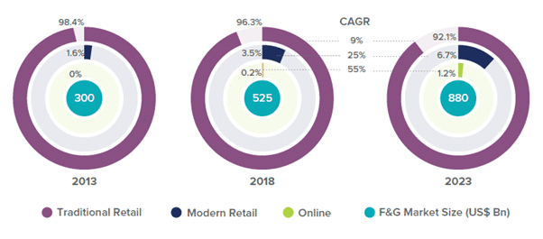 Of India’s retail basket, Food & Grocery (F&G) category comprising fresh fruits & vegetables, packaged food, personal care & home care and utilities is a significant 65% ($525 Bn) of the wallet spend whilst the organized share is marginal, at lowest penetration factor of 3.6% contribution.