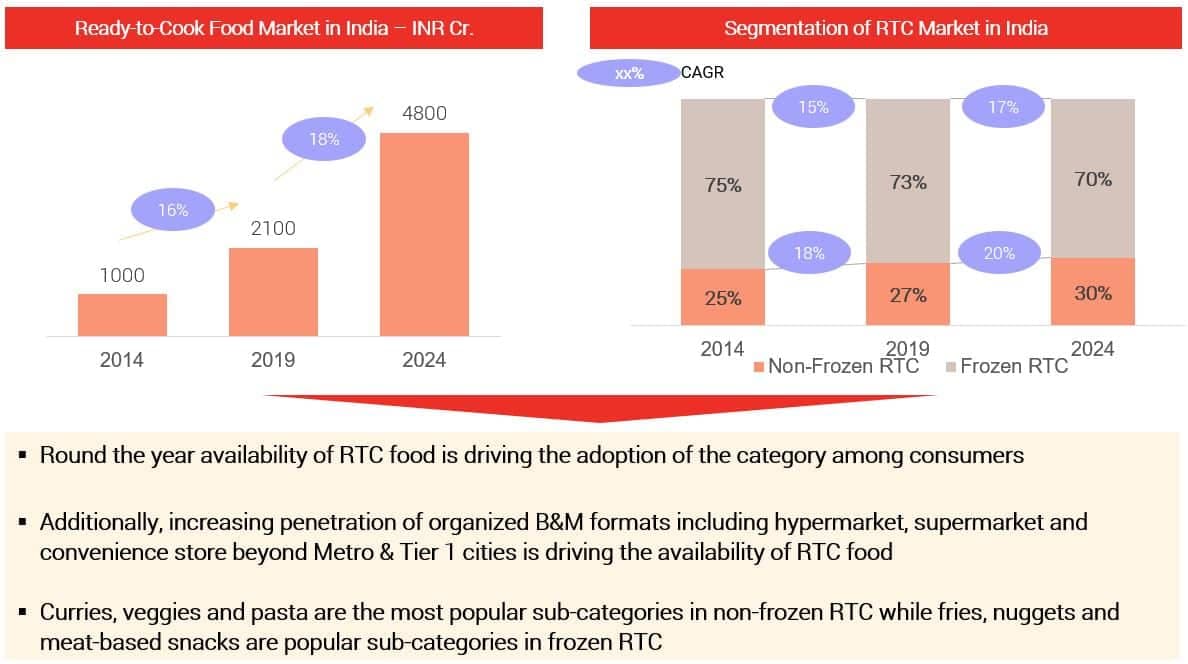 Ready to Cook market in India stands at INR 2100 Cr in 2019 and the market is expected to grow at a CAGR of 18% to reach INR 4800 Cr by 2024. Ready to Cook market is segmented into non-frozen and frozen RTC product with the frozen taking bulk share of the market at present. However, non-frozen RTC is expected to grow at a faster pace compared to frozen RTC food and the mix of frozen and non-frozen RTC is expected to evolve from 73%:27% in 2019 to 70%:30% by 2024