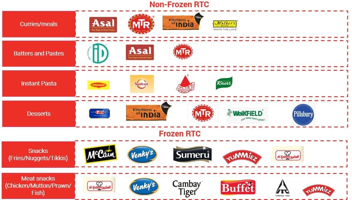 The market for frozen RTC and non-frozen RTC food products is marked by a distinct set of players. Currently, the non-frozen market is led by domestic brands such as MTR, Gits offering ethnic meals and curries and are increasing their presence across the country by launching products in accordance with the regional taste of consumers. However, frozen RTC market is currently led by McCain, which a leading global brand in the category and long-tail of domestic brands offering mostly potato or meat-based products.