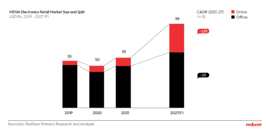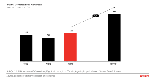 The electronics market in MENA is currently ~$60 Bn and is forecasted to grow at a CAGR of 9% to be a ~100 market by 2027. UAE & KSA account for close to half of the market currently and their share is expected to further increase, going forward as these regions are extremely digitally savvy and boast of high disposable incomes. Additionally, the transition towards a digitally enabled lifestyle, observable across the MENA region will drive future demand for electronics products.