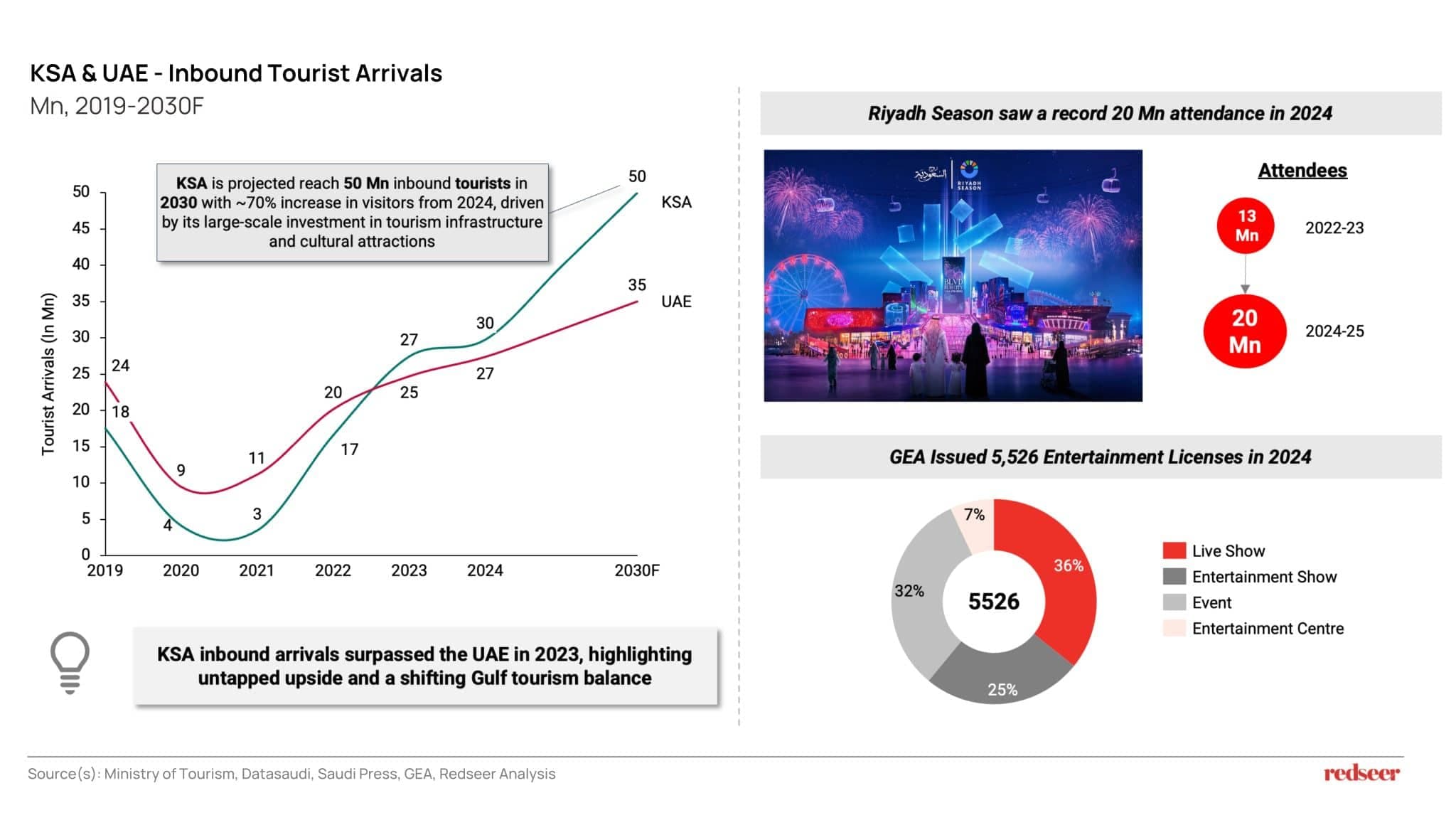 The sector’s momentum is also being reinforced by a broader shift in Saudi Arabia’s tourism and destination positioning. Inbound arrivals have accelerated meaningfully, with KSA inbound arrivals surpassing the UAE in 2023, signaling a changing Gulf tourism balance and strong headroom for continued growth. Looking ahead, KSA is projected to reach 50 million inbound tourists by 2030, implying roughly 70% growth from 2024 levels, supported by large investments in tourism infrastructure and cultural attractions. At the same time, flagship events are already demonstrating mass scale, with Riyadh Season recording 20 million attendees in 2024. On the supply side, execution capacity is deepening as well, reflected in 5,526 entertainment licenses issued by the GEA in 2024 alone.