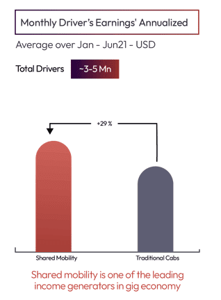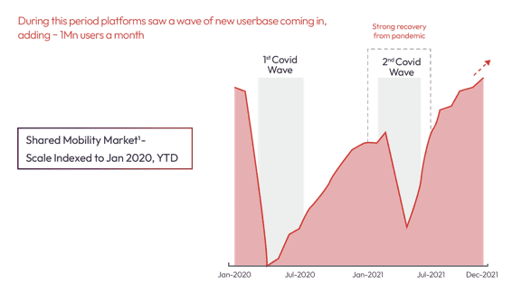 Shared mobility is making a strong comeback after the second wave of the Covid pandemic. In fact, a 5X growth is expected in the shared mobility market over the next few years, fueled by growing disposable incomes. This will be spurred in part by the fact that the public transport infrastructure is woefully inadequate to meet the burgeoning demand of an increasingly mobile population looking for convenience and affordability. Between January 2020 and December 2021, platforms saw a wave of new users adding ~1 million users a month.