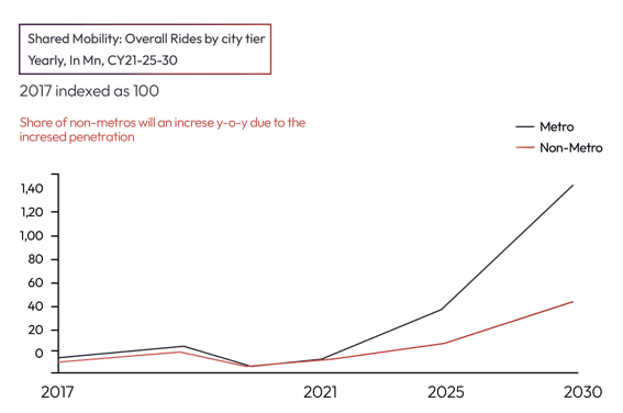 In the years to come, the shared mobility sector will witness greater democratization with the share of moto increasing against the backdrop of low ARV and geographic penetration into smaller cities. And by 2030, we can also expect to see more categories evolving. Penetration in non-metros will also increase, giving a fillip to the economy, and creating a viable revenue-generating opportunity for more than three million drivers across various platforms.
