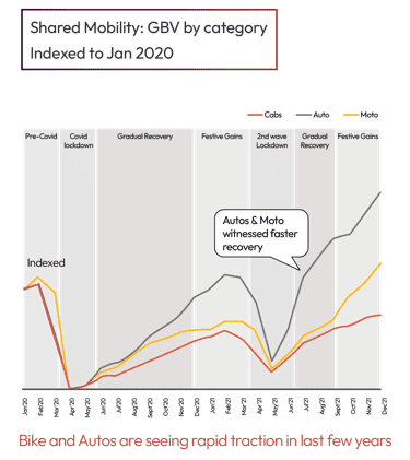 Post Covid, bikes and autos have been seeing rapid traction, gaining share quickly within the wider market. There could be a few possible reasons for the faster recovery of these segments compared to cabs. Lesser risk of contracting infections and affordability quotient could be significant drivers in the post-pandemic world.