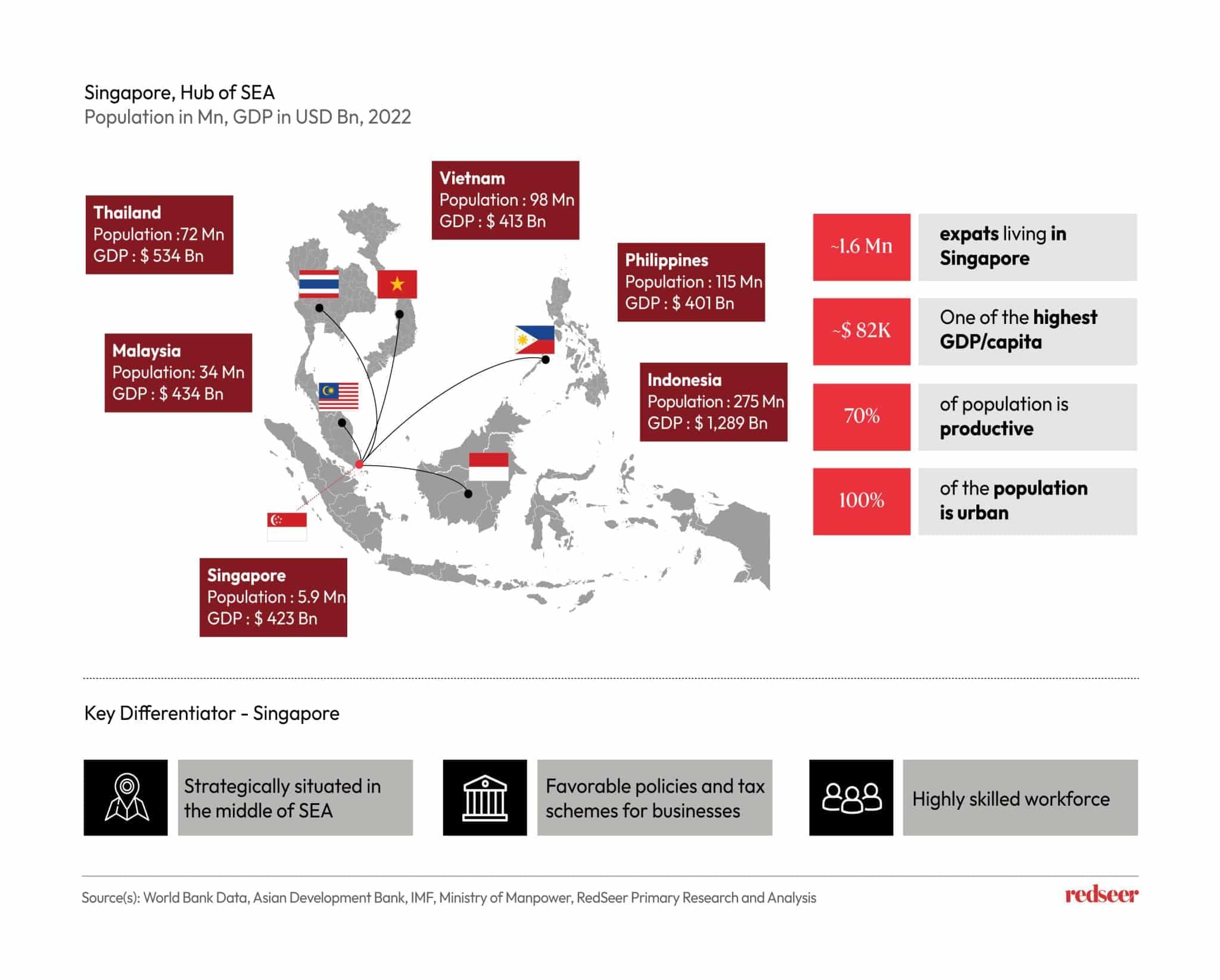 Singapore is viewed as the gateway to the SEA economy due to its strategic location. Many international companies establish themselves here, attracted by favourable tax schemes and its advanced economy, a fully urban population, and a substantial expat community.