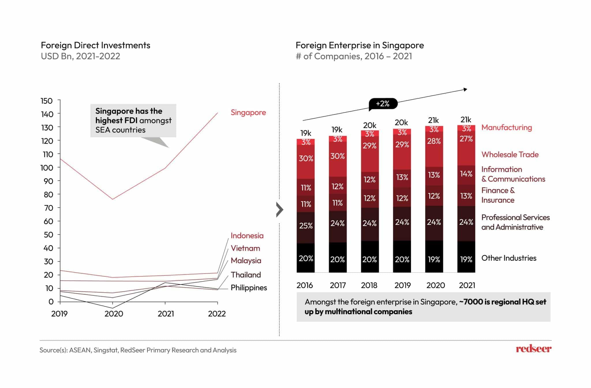 Singapore leads SEA countries in receiving the highest FDI. The number of foreign enterprises is also rising annually, with around 7000 MNCs establishing their regional HQ in Singapore