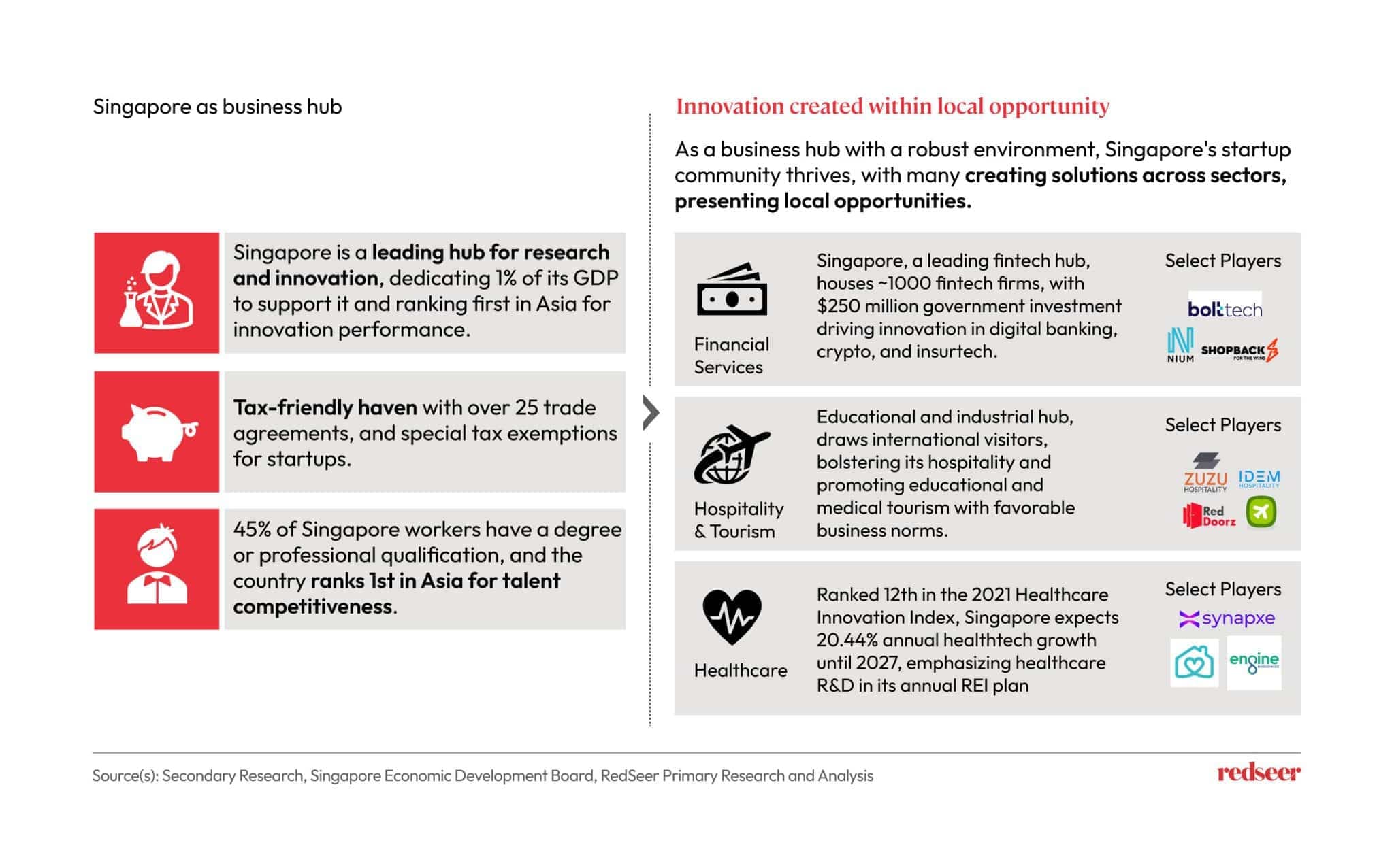 Singapore’s prominence in research and innovation, advantageous tax schemes, and highly skilled workforces make it an ideal business hub, fostering innovation and local opportunities across sectors such as financial services, hospitality, tourism, and healthcare.