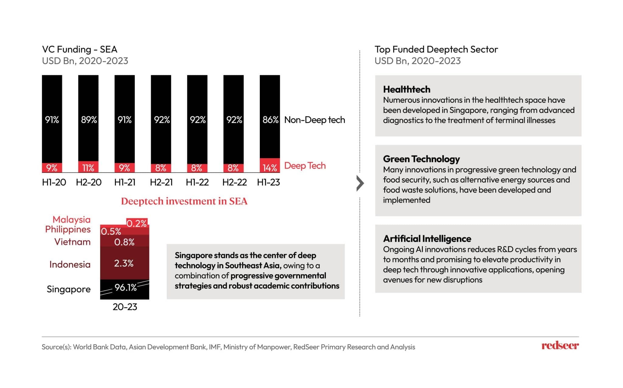 Singapore serves as the R&D hub in SEA, thanks to progressive governmental and academic contributions. This year, SEA’s deeptech funding has notably increased, with most innovations occurring in healthtech, green technologies, and AI.