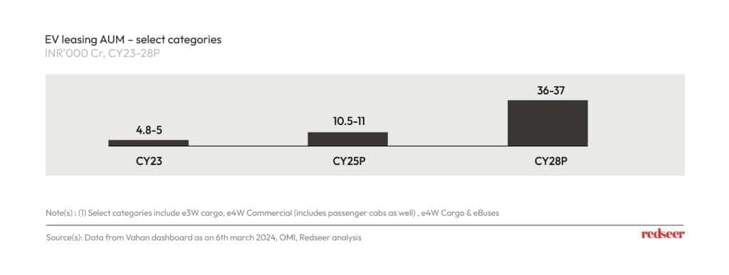 Now, let us look at the EV leasing market trendline. As of CY 23, the electric vehicle (EV) leasing market boasted a whopping Rs 5,000 crore in Assets Under Management (AUM). However, projections indicate that this figure is just the tip of the iceberg, with estimates foreseeing an aggressive growth trajectory by the year 2028. Experts anticipate the EV leasing market to skyrocket, reaching an unprecedented Rs 36,000–37,000 crores, which is equivalent to an eight-fold increase over the span of just five years! Well, this surge underscores the immense potential that is inherent within this sector, promising to revolutionise the transport industry.