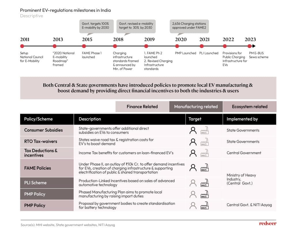 The Central and State governments both have implemented policies aimed at fostering local EV manufacturing and hence stimulating consumer demand through a range of incentives. The FAME policy, in its Phase II, earmarks Rs 10,000 crore to provide demand incentives for EVs, facilitate the development of charging infrastructure, and support the electrification of public and shared transportation. Additionally, the Production-Linked Incentive (PLI) Scheme offers incentives based on sales of advanced automotive technology. The PMP (Phased Manufacturing Policy) complements these efforts by promoting local manufacturing through increased import duties, thus encouraging domestic production of EV components. Moreover, proposed standardization norms for battery technology by government bodies also seek to streamline the EV manufacturing processes.