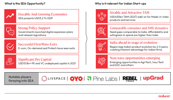 Considering the comparable consumer and MSME dynamics between India and SEA, startups here are in an advantageous position to tap into the $430 Bn TAM (2027) of SEA. Supportive regulations by the regional governments also make it easier for investors to get in and exit from the countries, as many have successfully done so far.