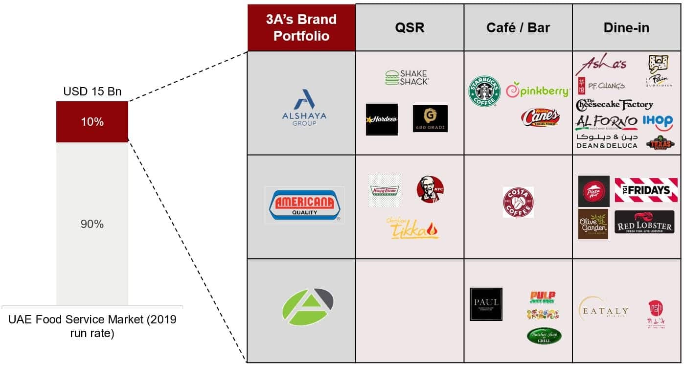 UAE food service market is ~USD 15 Bn in size (2019 mid year run rate). The market is driven by large business houses – Alshaya, Americana and Azadea. These three business houses combined control ~10% of the food service market of UAE. Alshaya with the largest portfolio is led by Starbucks, The Cheesecake Factory and P.F.Chang, while Americana with Pizza Hut, KFC, Costa Coffee and TGIF is capturing significant market share. Azadea with Pauls and Pulp Juice is the third biggest player in the country.