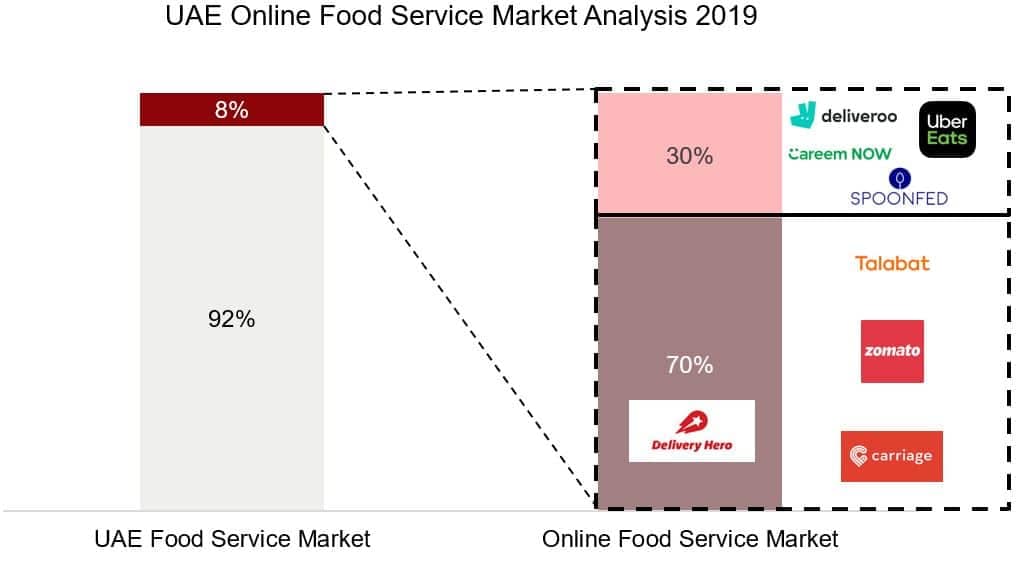 Delivery Hero with its portfolio brands – Talabat, Zomato and Carriage lead the market with ~70% share. Deliveroo, Uber Eats and Careem Now are other big players which represent the rest 30% of the market.