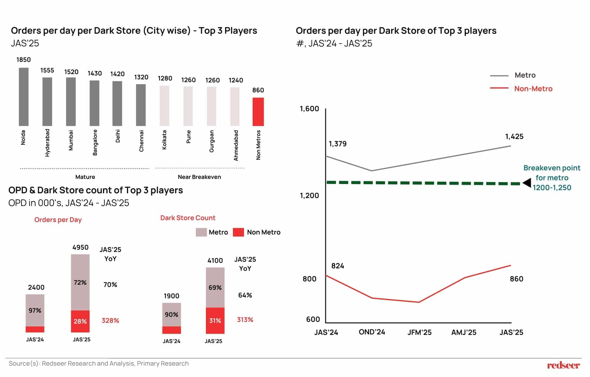 City-wise OPD/DS data reveals that only a handful of mature metros consistently operate at or above the 1,200–1,250 breakeven range, with utilisation outcomes varying sharply by city cohort and vintage. Non-metro dark stores still hover around ~850 orders per day per dark store.