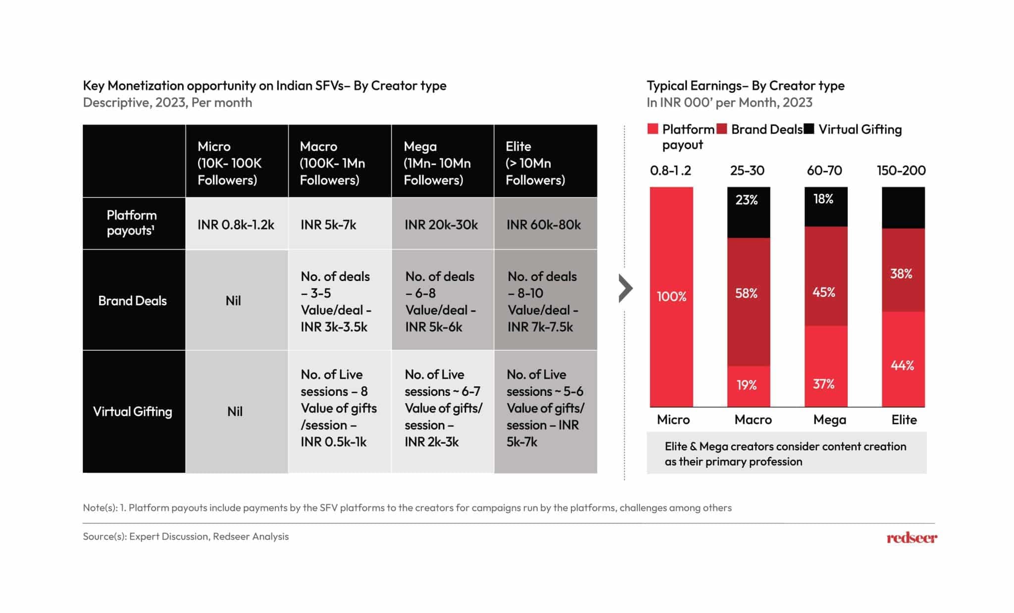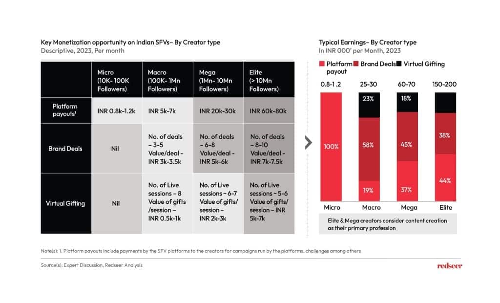 Micro influencers rely on platform payouts for income while Elite influencers making 1.5-2+ Lakh per month diversify into brand deals and virtual gifting