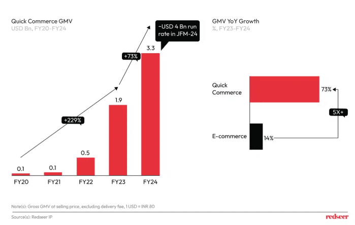In FY24, the Q-commerce market experienced a growth rate of 70-75%, outpacing traditional e-commerce. This has rapidly become an integral part of urban Indian life, offering expedited delivery services that cater to the demand for convenience. Projections for FY25 indicate continued expansion, with an expected market size of approximately $6 billion.