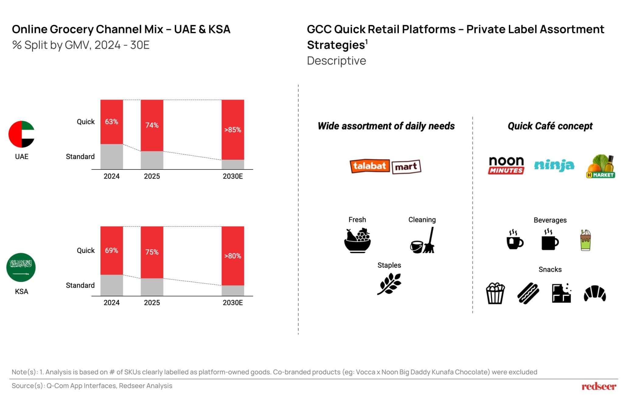 The pattern is consistent: platforms start with high-frequency staples, then expand to snacks/beverages and fresh products. GCC platforms are following a similar trajectory