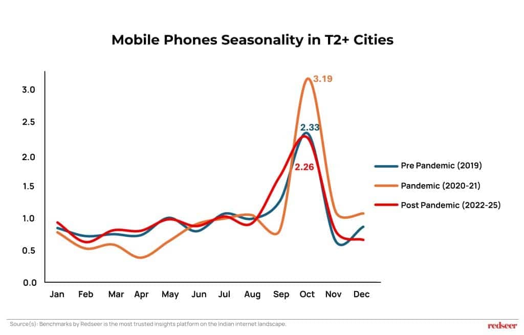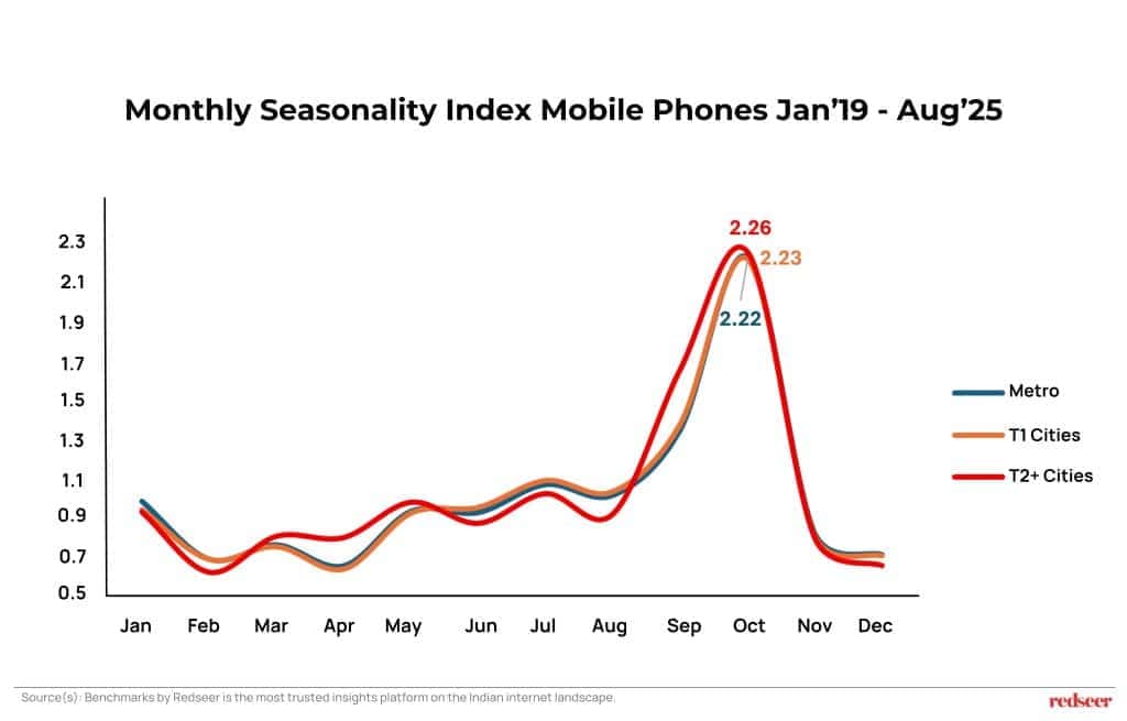 - Seasonality Peak Concentrated: T2+ markets exhibit the highest seasonality in mobile phones when compared to metros. Furthermore, despite the overall market showing signs of “de-seasonalization,” the volatility remains very high in T2+ cities even in the post-pandemic period. This proves the extreme Sept-Oct peak is fundamentally a sustained T2+ consumer event for the sector.