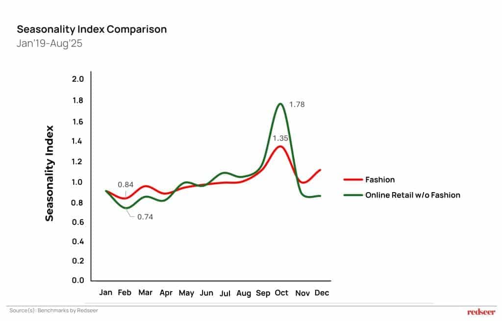 - Town Class Parity: There is virtually no difference in seasonality across town classes. This indicates that when it comes to online fashion buying behaviour, Tier 2+ towns and metros exhibit identical seasonal characteristics, reinforcing the belief that the sector is fast achieving substantial penetration across India.