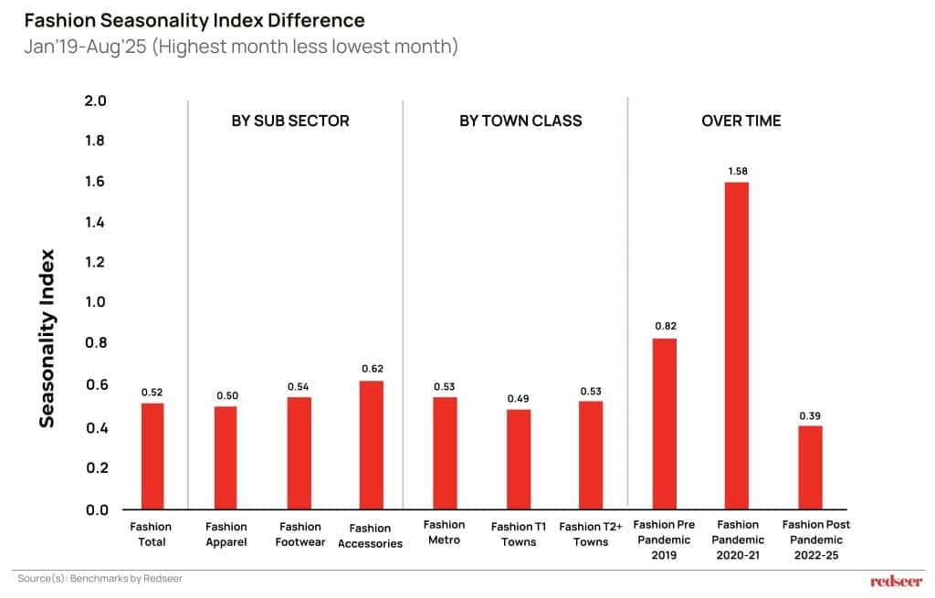 - Subsector Nuance: We observe only marginal differences across fashion subsectors, with accessories – the smallest subsector – exhibiting marginally higher seasonality than apparel.