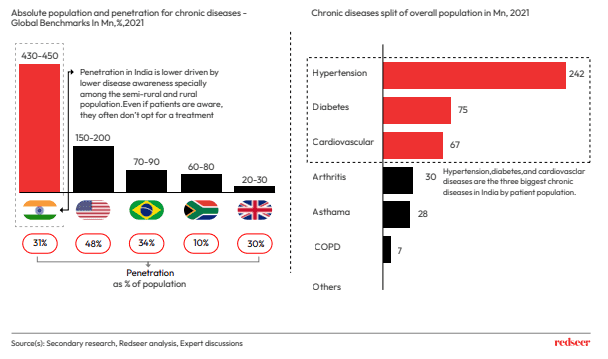 1. India has one of the highest population of patients suffering from chronic diseases, within which Hypertension, diabetes, and cardiovascular are the three largest chronic conditions, in terms of prevalence among population