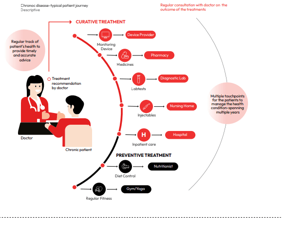 The disease burden in India is led by chronic conditions (largely diabetes, hypertension and cardio-vascular) that last for at least an year and up to a person’s lifetime and account for ~65% of the total deaths in the country, putting 400-450 million chronically ill people at a huge risk. The risk became evident during the pandemic, when the population with existing chronic conditions was considered prone to the COVID-19 infection and the associated complexities. Moreover, India’s infrastructural gaps make the chronic treatment journey cumbersome and expensive, establishing a dire need for convenient and affordable solutions to manage the chronic conditions. New-age players are leveraging the power of technology to address this large and pressing need. We’ve spoken previously on the emergence of Digital PHRS, and how HealthTech is bringing respite to millions of patients in the country. In this newsletter, Kushal Bhatnagar throws light on yet another development: Total Healthcare Integration. Read on for more on this!