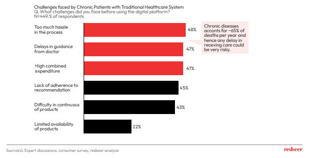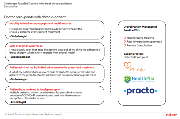 Typically, a chronic patient’s healthcare journey includes consultations and follow-ups with doctors, regular vital monitoring, purchasing medicines, undergoing lab tests, making dietary changes (and monitoring these changes) and more. This complex process spans across multiple years (could go on for a lifetime), leading to a painful experience for the patient and his / her family. Moreover, chronically-ill patients complain about the delays in guidance from the doctor and extremely high expenditure on treatments. These challenges are even more pronounced in India, given the below-par doctor to patient ratio and poor insurance coverage (almost zero coverage of out-patient care expenditure).