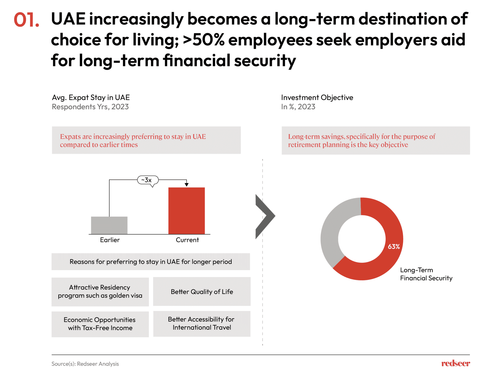 The UAE has maintained its appeal to expats, who now express a greater inclination to extend their stays compared to previous years (~60% of expats intend to reside in the UAE for more than a decade). This inclination toward a longer stay has consequently led to >50% of employees prioritizing long-term financial goals, particularly centred around investment objectives such as retirement planning.