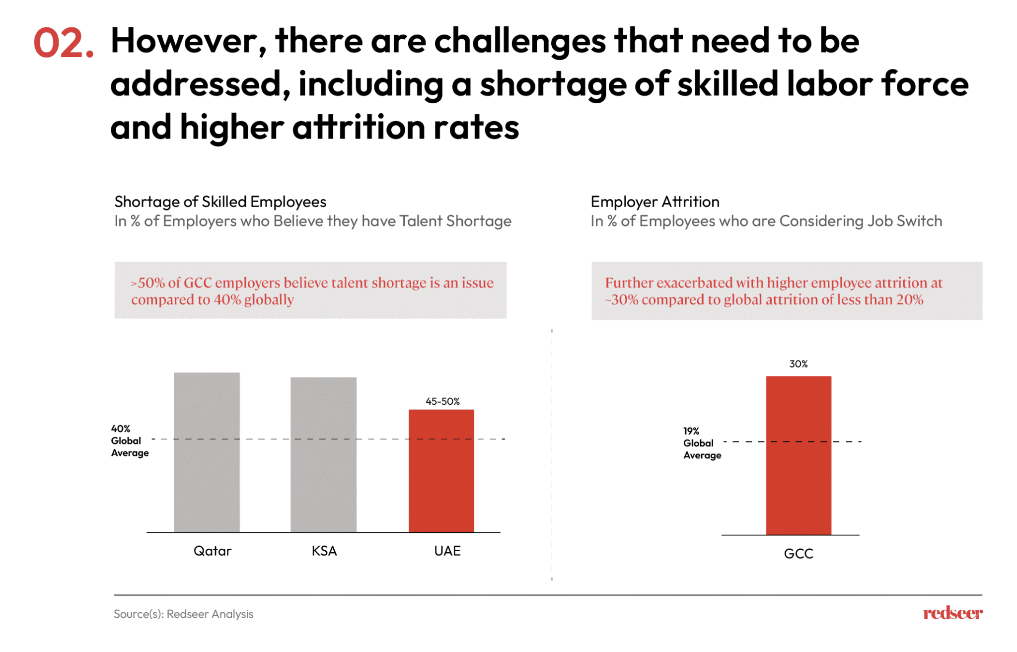The region has grown notably more demanding, giving rise to what can be described as a talent war. This situation has been intensified by the fact that more than 50% of employers in the GCC region perceive a shortage of talent, in contrast to the global average of 40%. The challenge is further compounded by a higher employee attrition rate of approximately 30%, which starkly contrasts with the global attrition rate of less than 20%.