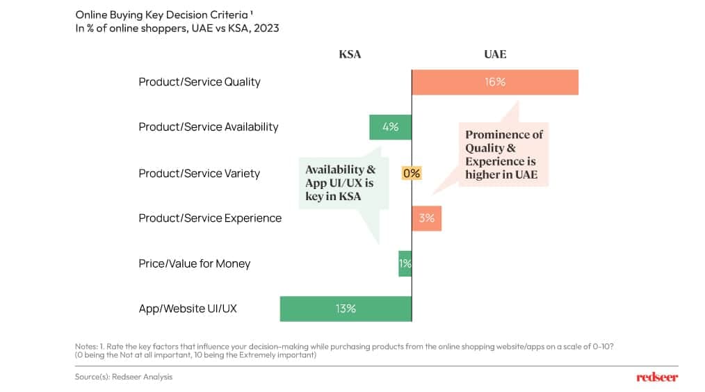 Further, within each decision criterion, the importance of quality stands out prominently in the UAE. As users are quite mature, brands must elevate their offerings to meet heightened expectations for quality and experience. On the other hand, in KSA, the growing demand for seamless platform experiences signals a pivotal shift in the digital economy. Further, as expats become a larger part of the population, the need for brands to prioritize user-centric design will become key.