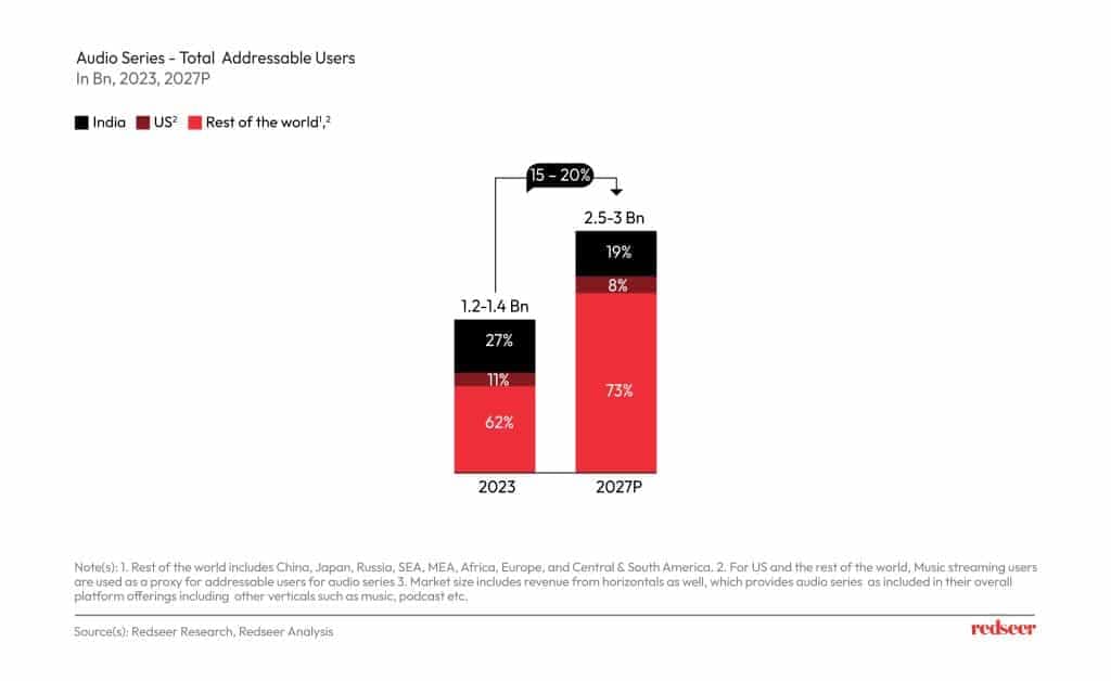 Now, let’s zoom in on India for a sec. Almost 27% of this 1.3Bn of this total addressable users come from India alone in 2023. And it’s only going to get bigger! Talk about growth! As digital infrastructure continues to improve and disposable incomes rise, the total addressable user base (TAM) for audio series is poised to grow exponentially in the coming years.