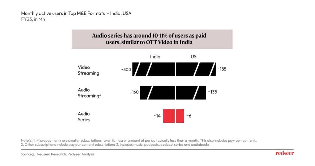 One of the most striking aspects of the audio series phenomenon is its ability to attract a diverse audience, including both traditional media consumers and digital natives. As an easy to consume platform, audio series are quickly gaining new monthly active users, and is set to capture a larger part of the media and entertainment pie. Paid user penetration in Audio Series is catching up fast with other entertainment formats in places like India. Even though it’s still a nascent industry with only 1-2 years since it launched, it has already captured an audience base at par with other mature video streaming and OTT platforms, with 10-11% of them being paid users.