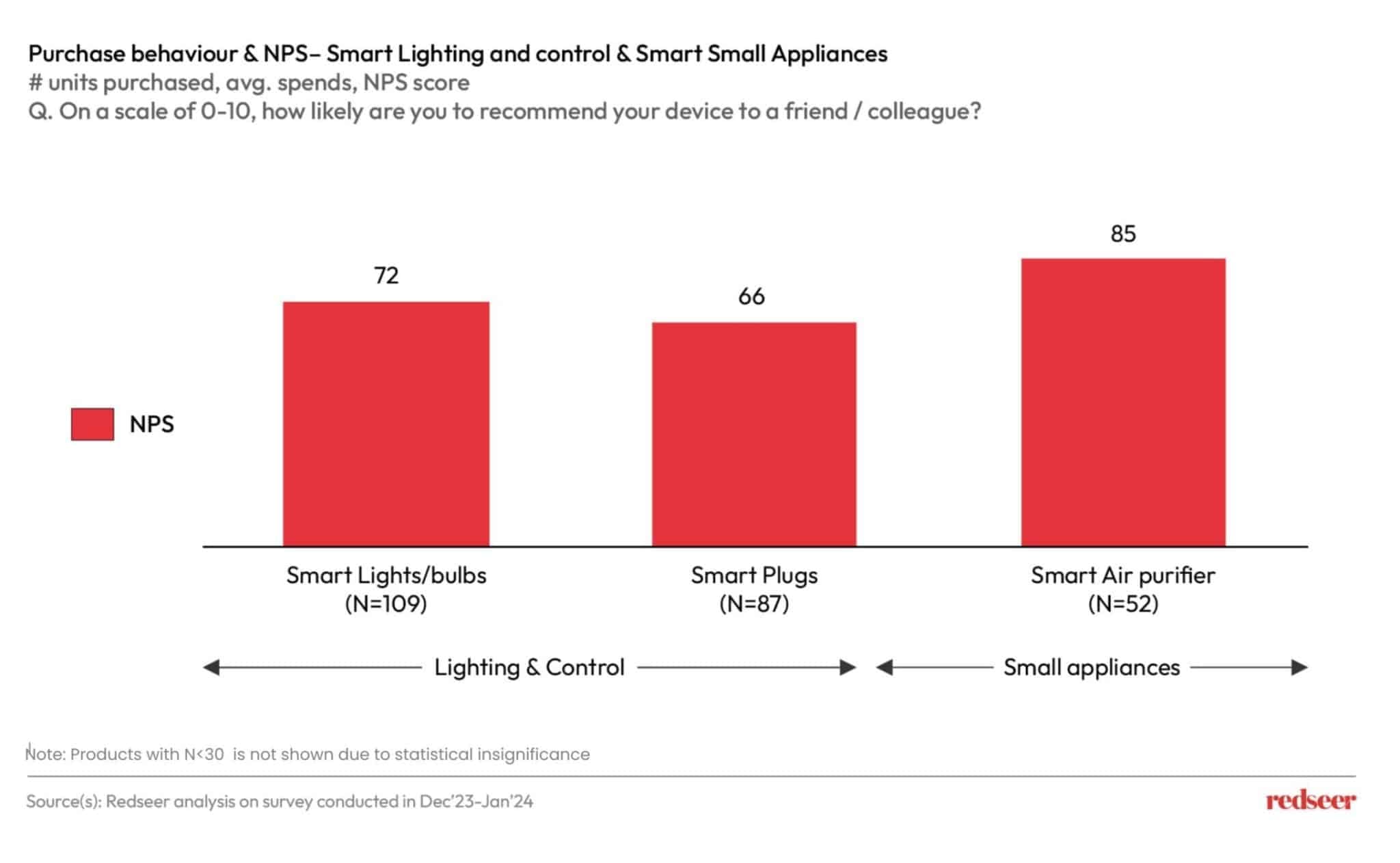 According to our study on purchase behavior and Net Promoter Scores, there is a rising interest in non-security categories as well, leading to increased adoption of smart home devices. For instance, smart bulbs achieved an impressive NPS of 72, making them the top choice in the Lighting and Control segment, while smart plugs followed closely with an NPS of 66. In the smart small appliances category, smart air purifiers led with an exceptional NPS of 85. This trend highlights how more customers are embracing home automation through smart devices and designing their homes accordingly!