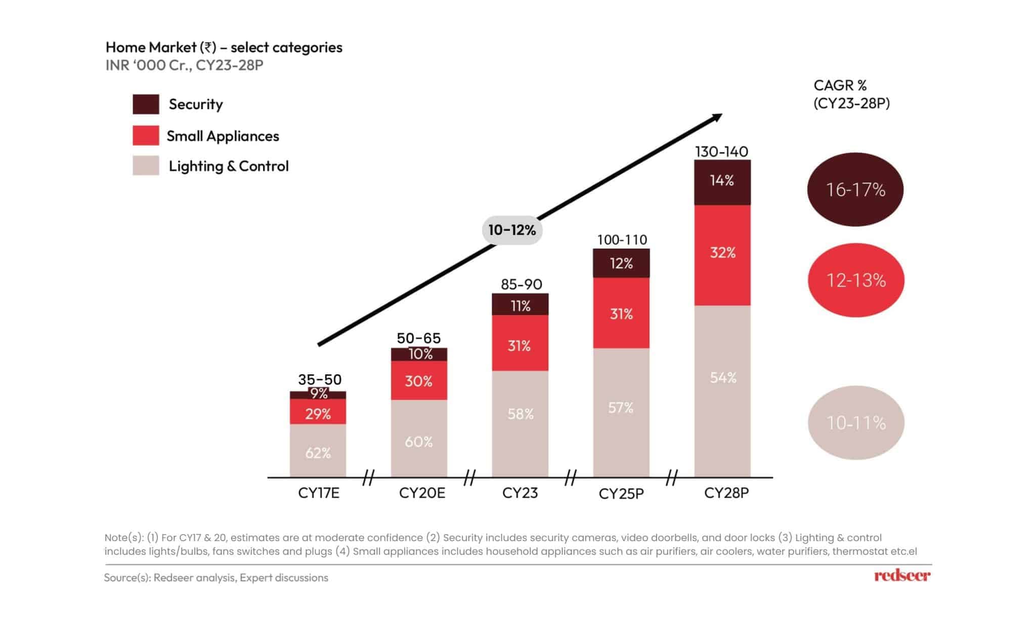 Across both smart and non-smart spheres, these categories were a market worth ~INR 90,000 crore in 2023 and projected to expand by ~1.5 times to reach ₹140,000 crore by 2028. Security is expected to grow the fastest increasing in contribution to ~14% by CY28, while other categories are expected to grow steadily for the same time period