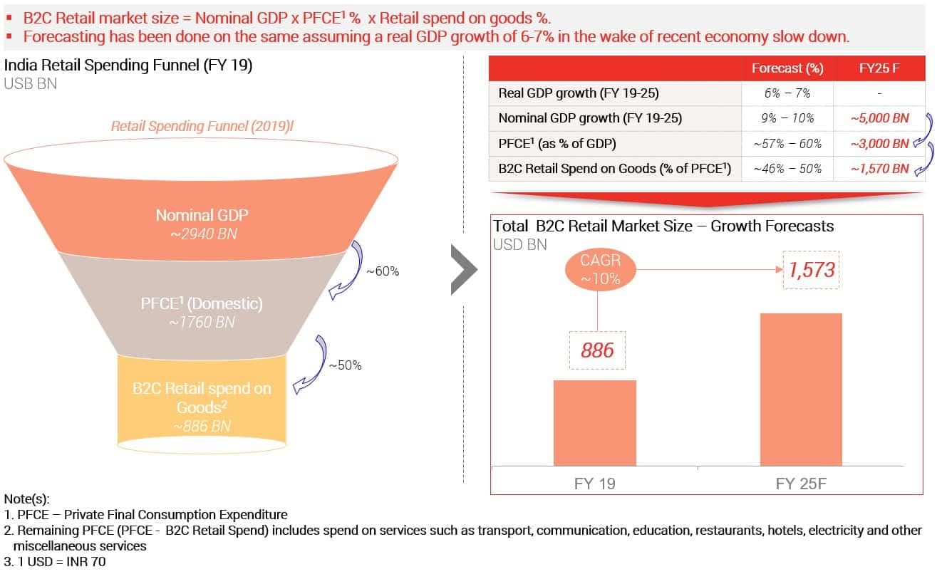 Despite the current economic slowdown and our expected normalized real GDP forecast of 6 to 7%, we expect the private consumption expenditure to continue driving ~60% of the nominal GDP. And, this is predominantly going to be driven by consumer retail consumption of goods, which is expected to continue driving ~50% of the private consumption. Driven by the same, the consumer retail market will grow at 10% YoY to reach $1.6 TN by FY 25.