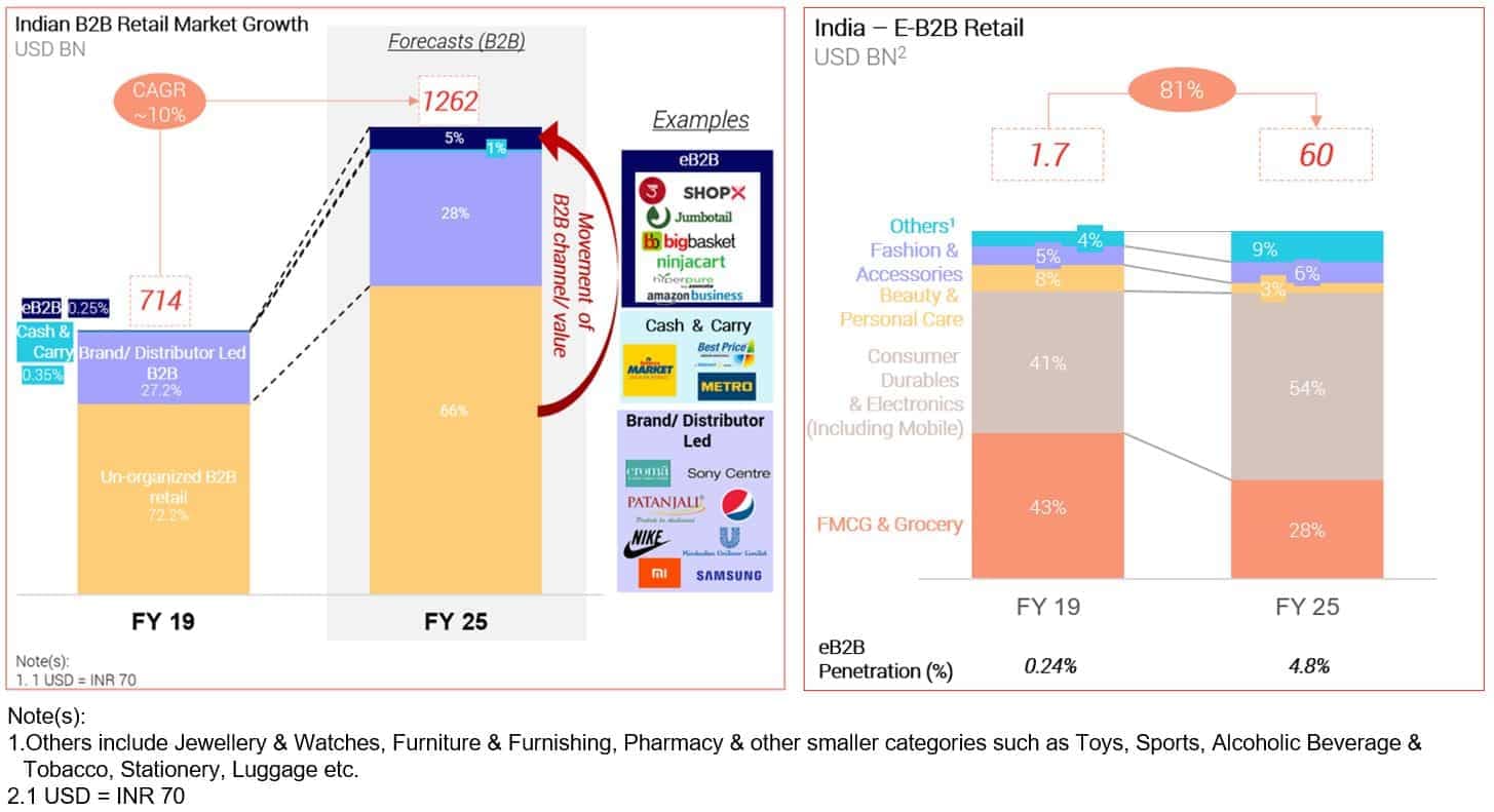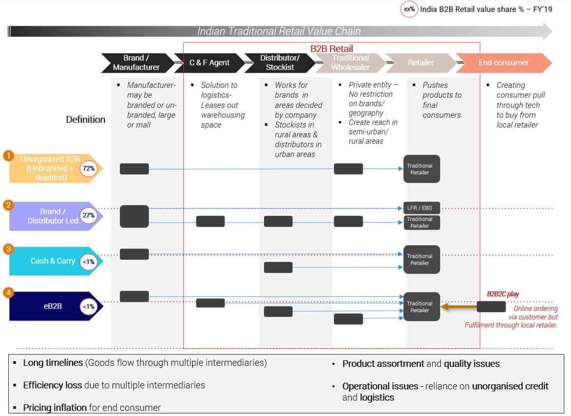This market is facilitated by a long B2B retail supply chain, which has multiple intermediaries, who engage through multiple models, with ‘Unorganized B2B’ driving >70% of the market
