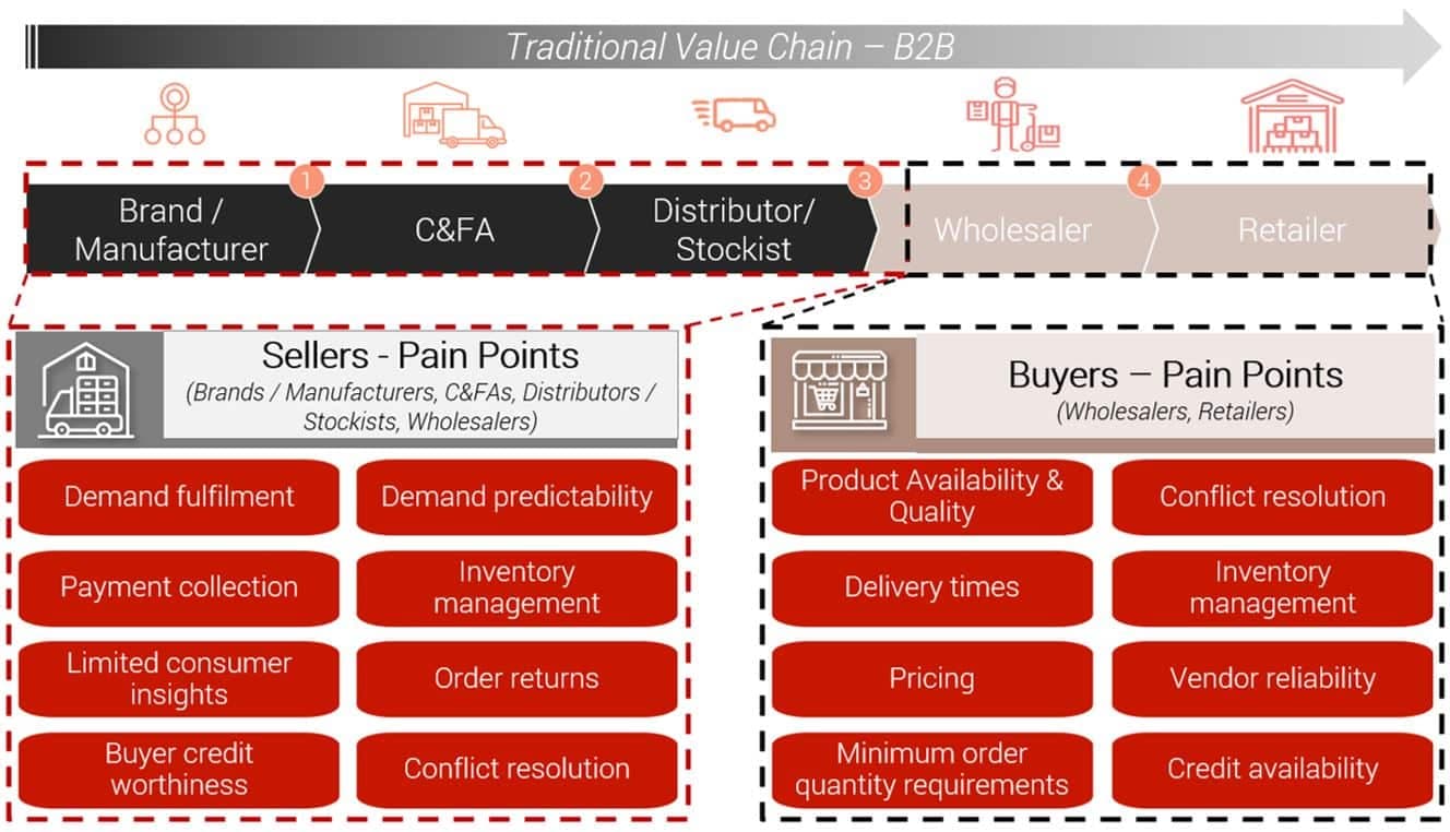 Various supply chain issues bog down everyone starting from brands, distributors, wholesalers, to retailers. During our research, we found several pain points that brands/sellers face. The problems range from understanding the exact demands and thus facing problems fulfilling them, collecting payments, predicting future demand due to unavailability of a reliable inventory management system, buyers creditworthiness to understanding what the end-user, actually needs due to limited or no contact with the consumer.